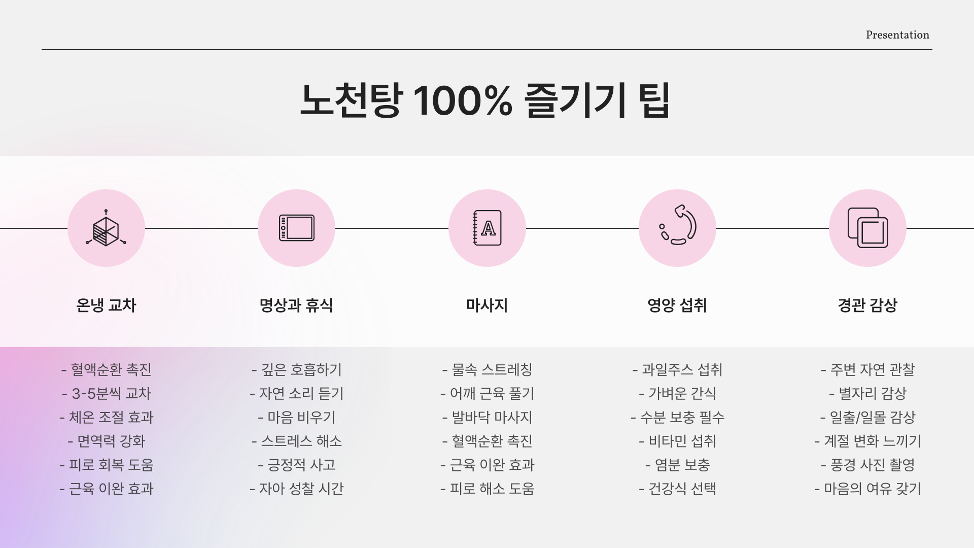 - 온천욕은 스트레스 해소와 건강 증진에 도움을 줍니다.