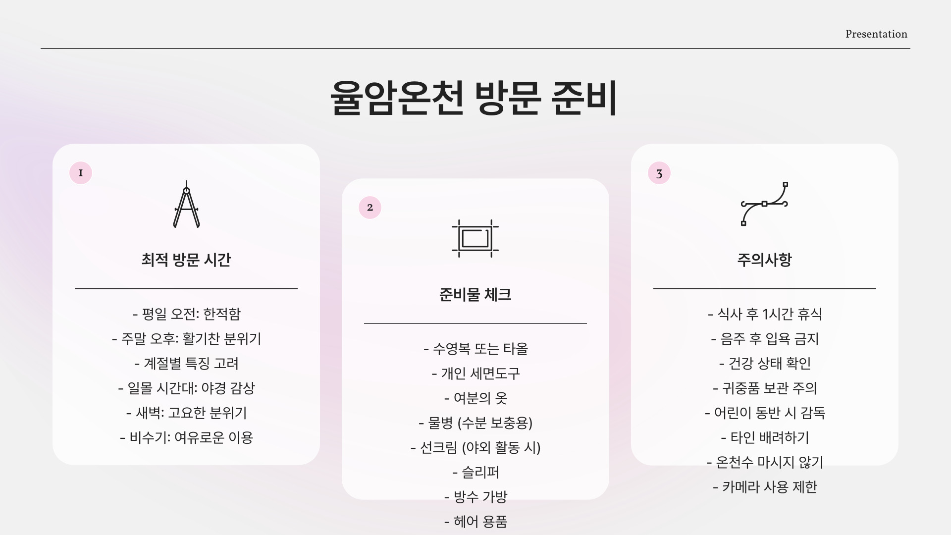 율암온천은 그 자체로도 유명하지만, 특히 노천탕에서의 경험은 많은 이들에게 특별한 의미를 가집니다. 노천탕에서 직접 자연의 소리를 들으며 온천욕을 즐기는 것은 스트레스를 해소하고 평온함을 느끼기에 완벽한 방법입니다. 그러므로 최상의 경험을 위해 준비해야 할 것들이 있습니다.