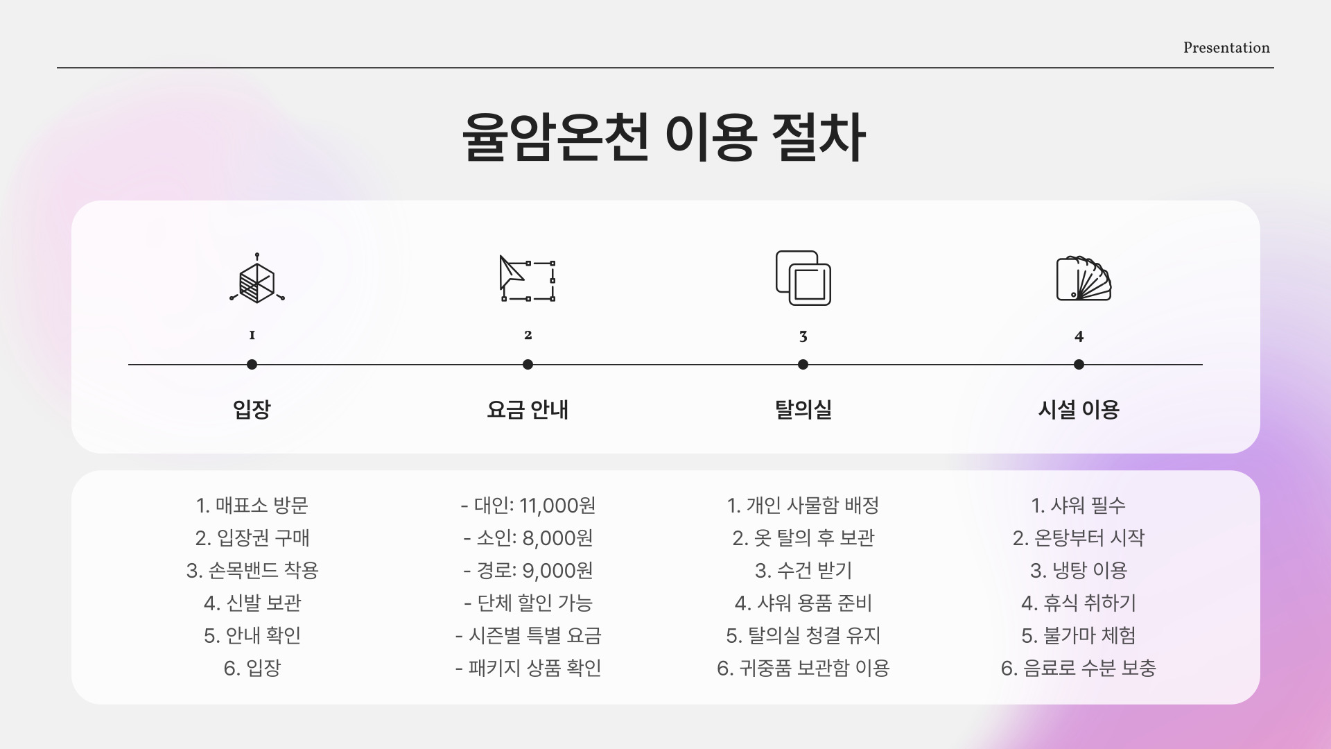 - 이용 시 수분 섭취와 안전 수칙을 준수하는 것이 중요합니다.