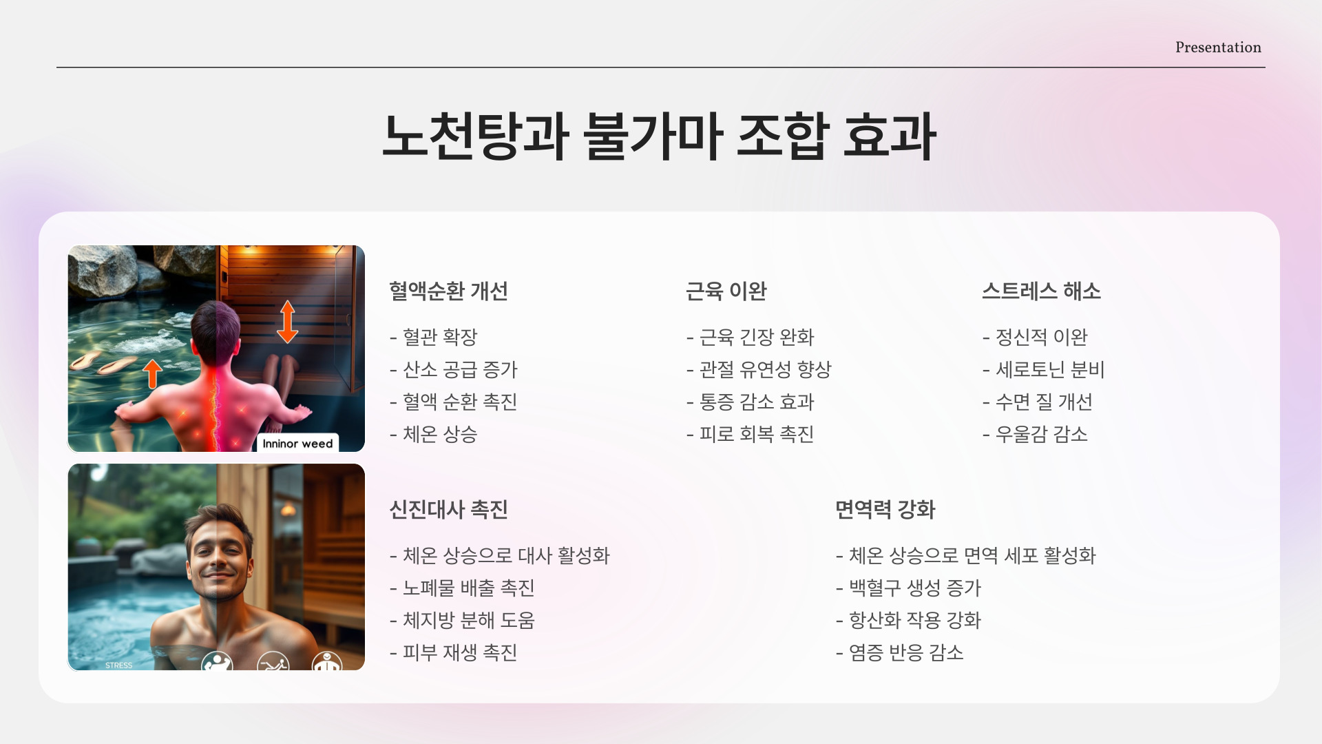 온천욕은 다양한 건강 효과를 가지고 있습니다. 특히 스트레스 해소근육 이완에 도움을 줍니다. 연구에 따르면, 온천수에 포함된 미네랄 성분이 혈액순환을 개선하고 피부 건강을 증진시킨다고 합니다. 따라서, 정기적으로 노천탕을 이용하면 건강에 많은 이점을 누릴 수 있습니다.