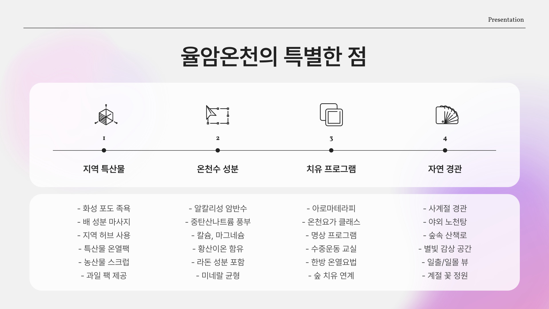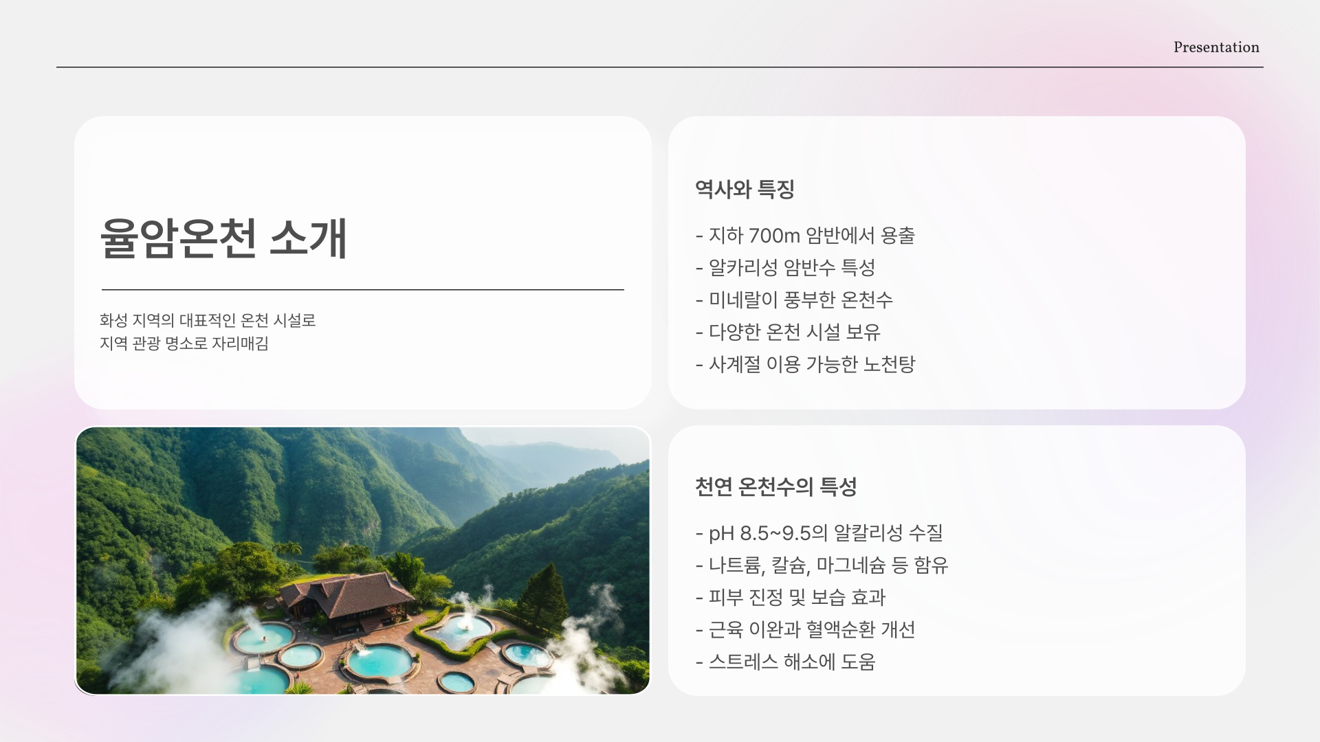율암온천의 물은 다양한 미네랄과 오염물질이 적어 피부에 매우 이롭습니다. 이곳의 물은 각각 특유의 효능을 가진 미네랄이 가득하여 피부의 탄력을 높이고, 체내 피로를 해소하는 데 도움을 줍니다. 또한 피부병 및 아토피 치료에 효과적이라는 연구 결과도 있으며, 이러한 장점 덕분에 많은 이들이 이곳을 찾고 있습니다.