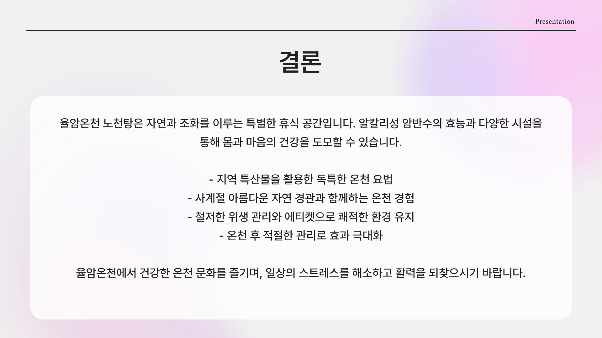 - 온천욕은 스트레스 해소와 건강 증진에 도움을 줍니다.