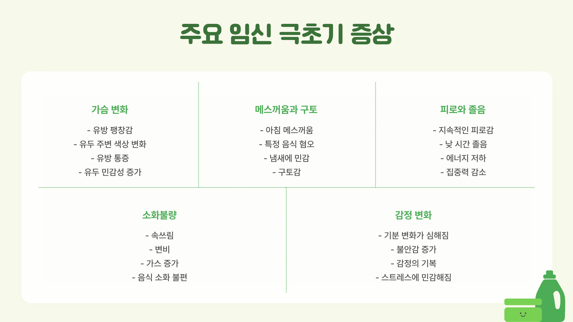 - 임신 극초기증상은 생리 지연, 유방 변화, 피로감 등이 포함된다.