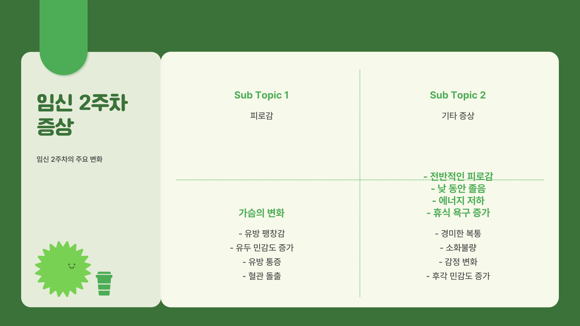 임신 극초기증상 시기에서는 노출되지 않았던 신체 신호들이 나타나는 것이 일반적입니다. 예를 들어, 많은 여성들은 보통 피로감과 유방의 민감함을 경험하게 됩니다. 이러한 증상은 호르몬 변화로 인해 발생하며, 임신이 확인되기 전부터 나타날 수 있습니다. 게다가 일부 여성들은 그보다 더 일찍, 아주 미세한 신체적 변화들을 느낄 수 있습니다.