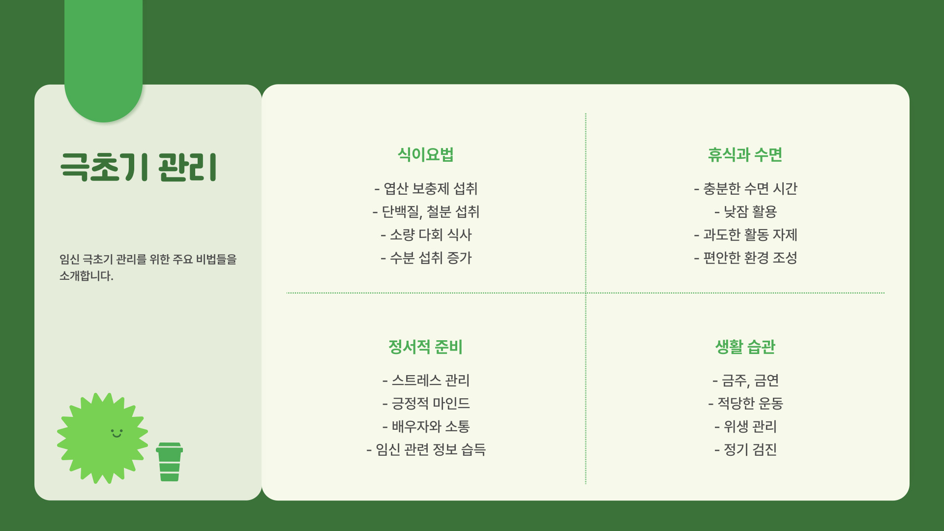 임신 초기 증상을 잘 관리하는 것은 매우 중요합니다. 규칙적인 생활과 올바른 영양 섭취는 임신 초기 증상을 완화하는 데 큰 도움이 됩니다. 예를 들어, 충분한 수면을 취하고, 스트레스를 줄일 수 있는 방법을 찾아야 합니다. 이렇게 하면 극초기증상이 나타날 때 더 잘 관리할 수 있는 상태로 준비될 수 있습니다.