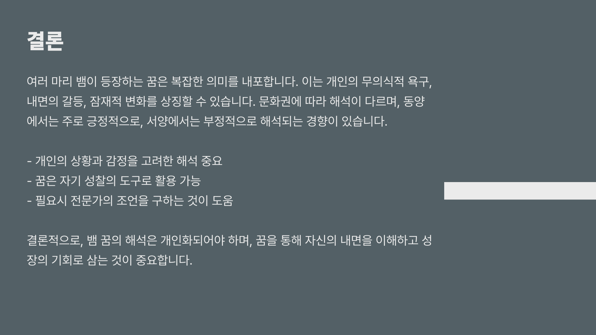 결론적으로, 꿈에서 여러 마리의 뱀이 나오는 것은 다양한 해석을 가능하게 하며, 이는 꿈을 꾼 사람의 현재 상태를 반영합니다. 꿈의 색깔, 행동, 상황을 통해 자신을 더 깊이 이해하는 기회를 제공받을 수 있으므로, 이러한 꿈을 경험했을 때는 이를 소중하게 여기는 것이 좋습니다. 꿈의 메시지를 잘 받아들이고 자신의 내면을 탐구해보는 시간을 가져보세요.