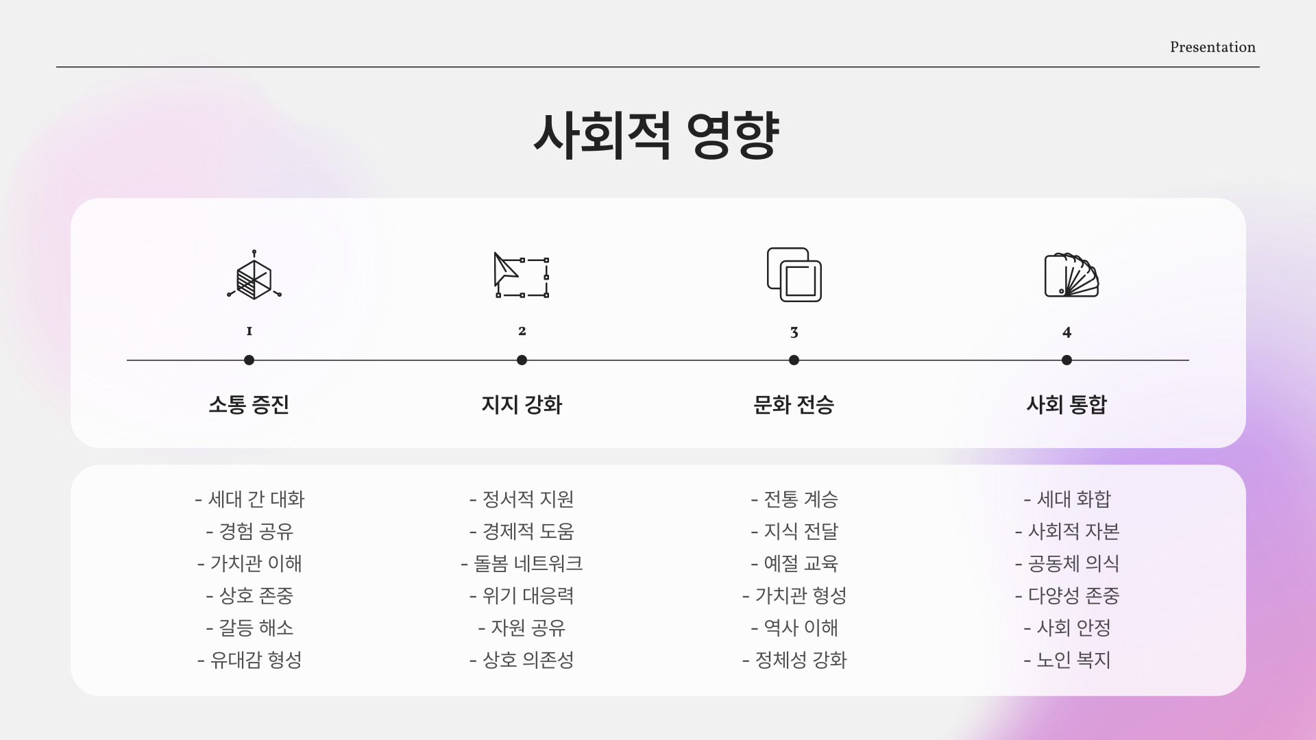 | 가족 모임 | 정기적으로 모여 서로의 삶을 공유한다. |