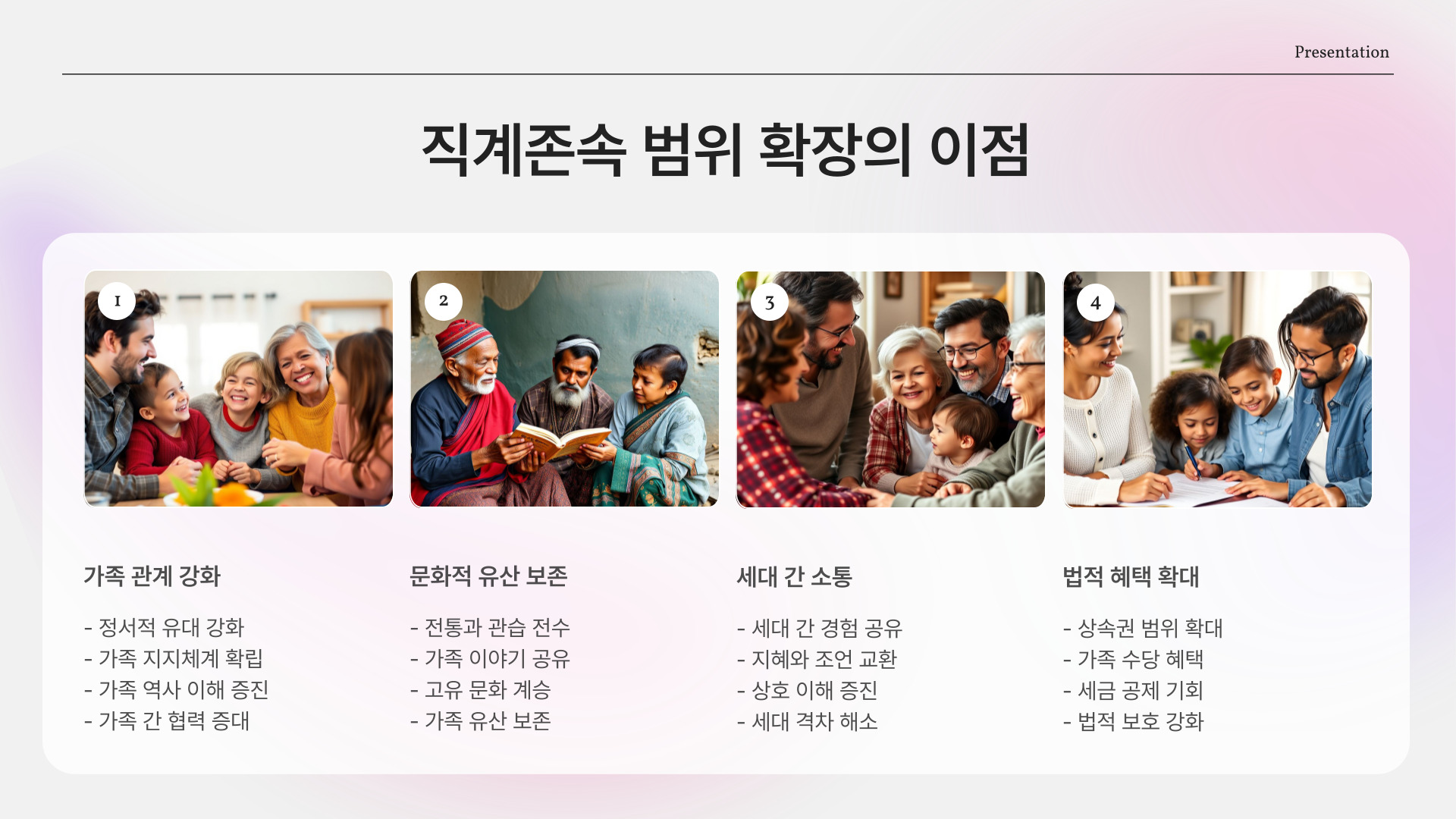 - 상속 계획이 가정의 평화를 유지하는 데 도움을 줌.