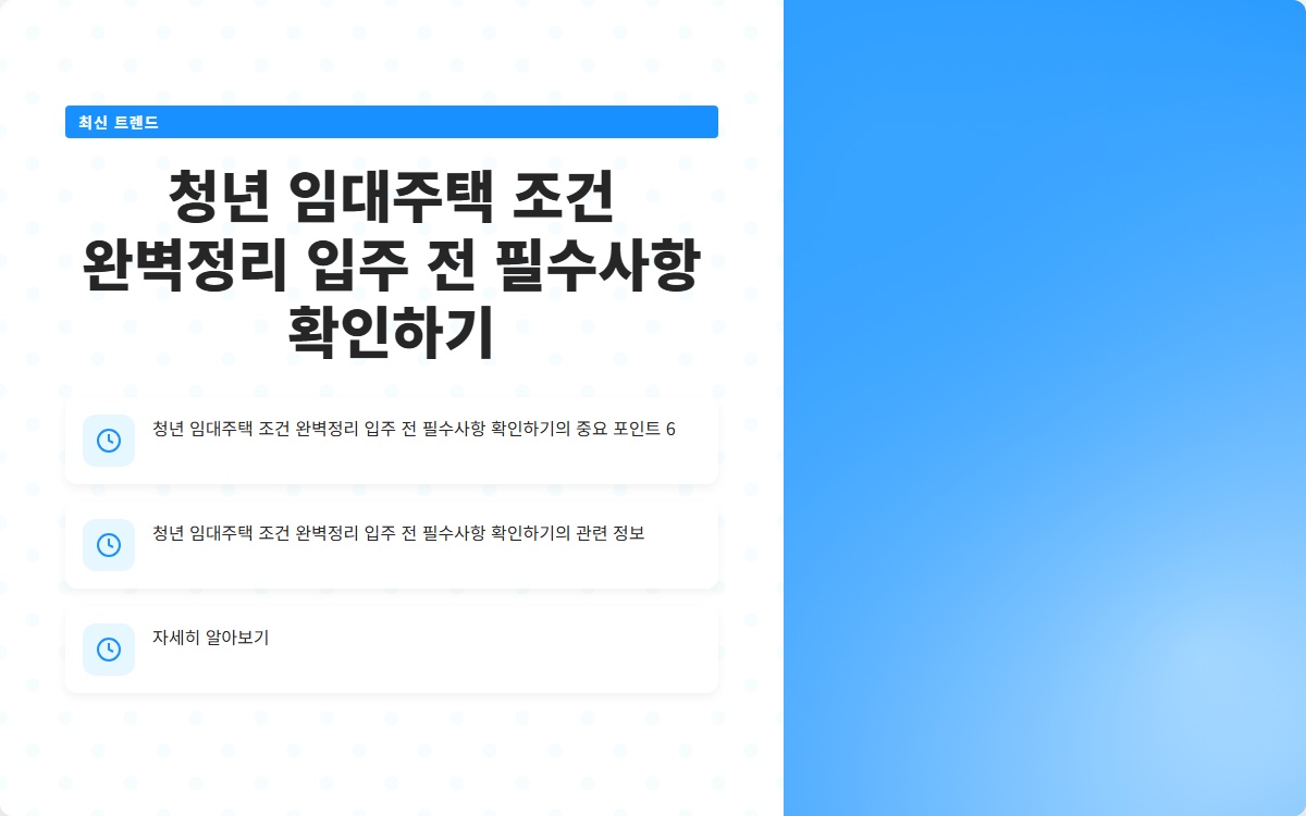 청년 임대주택은 주거 안정성을 원하는 젊은 세대에게 큰 도움이 될 수 있습니다. 청년주택 조건을 제대로 이해하고 사전에 준비해야 여러 혜택을 누릴 수 있습니다. 이 글에서는 청년 임대주택의 기본 조건과 입주 전에 확인해야 할 필수 사항에 대해 자세히 알아보겠습니다.