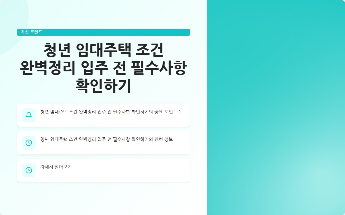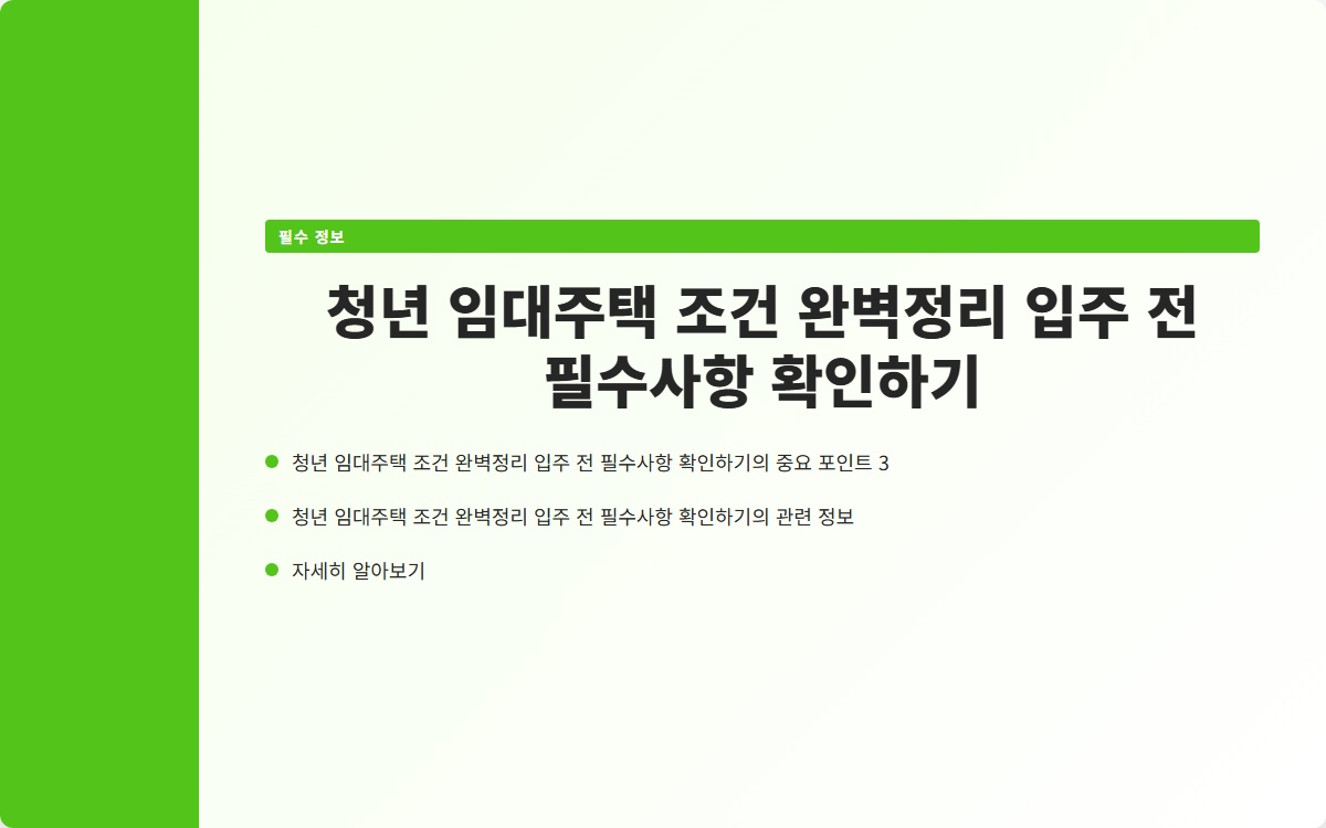 청년 임대주택은 청년들에게 안정적인 주거환경을 제공하는 중요한 정책입니다. 조건과 필수사항을 잘 이해하고 준비하여 성공적으로 입주할 수 있기를 바랍니다. 추가적인 궁금증이 있다면 관련 기관에 문의하거나 공식 웹사이트를 참조하는 것이 좋습니다.
