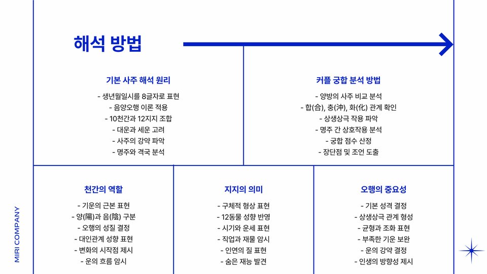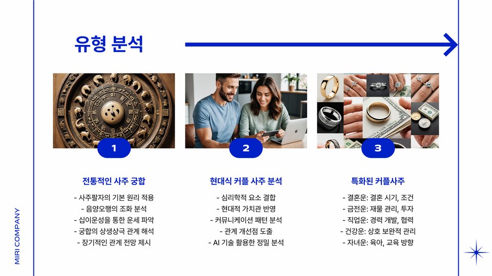 또한, 커플사주는 단순한 양자택일이 아닌 다양한 변수를 고려해 분석합니다. 예를 들어, 같은 성격을 지닌 두 사람이 만날 때와 정반대의 성향을 가진 두 사람이 만날 때 각각의 해석이 달라지기 때문에, 보다 심화된 분석이 필요합니다.