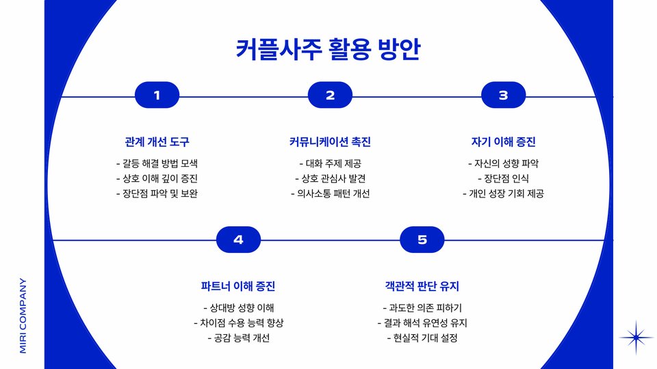 커플 궁합은 두 사람의 관계를 더욱 깊고 의미 있게 만들어줍니다. 서로의 사주를 이해함으로써, 각자가 어떤 점에서 부족한지, 어떤 점을 보완할 수 있는지를 알 수 있습니다. 이를 통해 서로의 강점을 살리고 약점을 보완해 나가면서, 보다 건강한 관계를 형성할 수 있습니다. 예를 들어, 한쪽이 감정적으로 기복이 심하다면, 다른 쪽이 안정감을 줄 수 있는 방법을 찾는 것이 좋습니다. 결국, 커플사주는 단순한 운세를 넘어서, 서로를 이해하고 존중하는 방법으로 작용할 수 있습니다.