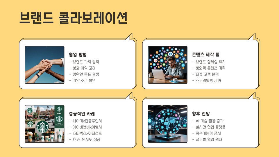 협업뿐만 아니라 자신의 네트워크를 확장하여 다양한 사람들과의 소통을 통해 새로운 아이디어를 얻을 수 있습니다. 실제로 다양한 이벤트나 온라인 세미나에 참여하는 것은 브랜드 인지도와 연관성을 높이는 방법 중 하나입니다.