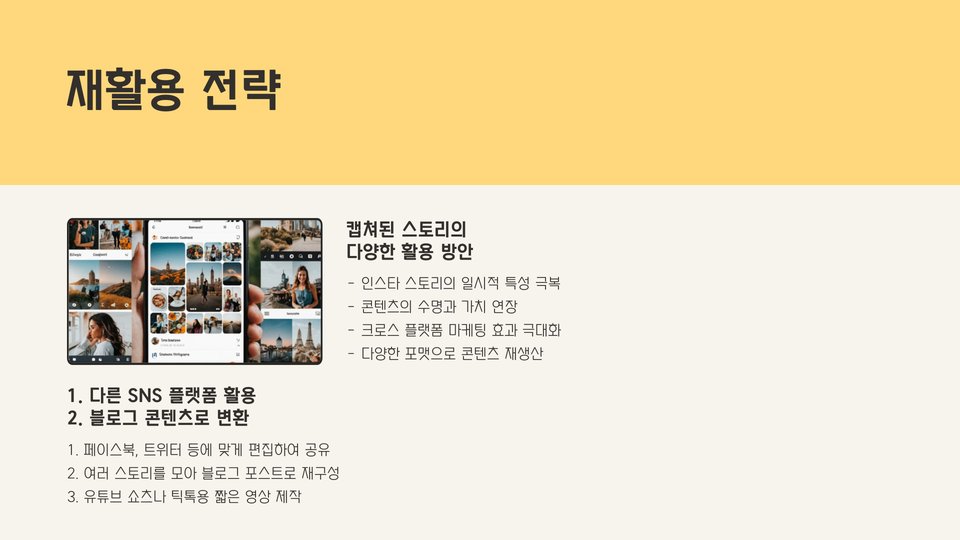 | 창의적인 콘텐츠 제작 | 독특한 시각적 요소와 이야기로 팔로워의 관심을 끌기 |