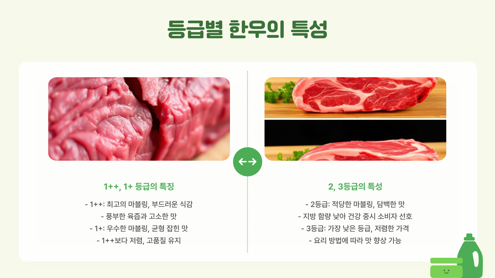 • 한우는 1++부터 3까지,总 등급으로 나뉘며, 등급이 높을수록 마블링이 뛰어나다.