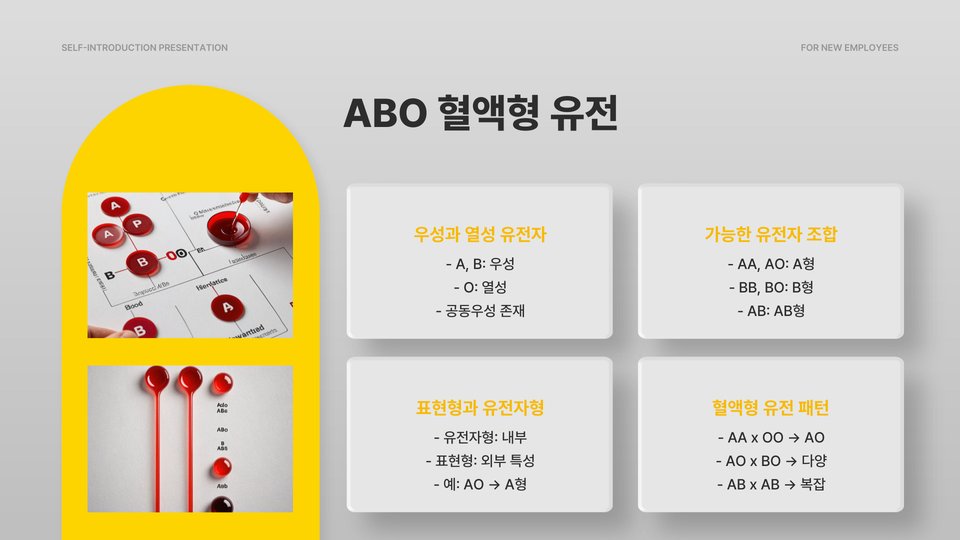 ABO 혈액형 시스템은 A형 유전자 (IA), B형 유전자 (IB), 그리고 O형 유전자 (i)의 조합으로 이루어져 있습니다. 이러한 유전자의 조합은 부모의 유전형에 따라 다양하게 나타나며, 자녀의 혈액형은 부모의 혈액형에 따라 예측할 수 있습니다.