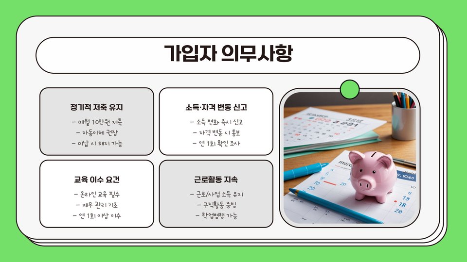 청년내일저축계좌는 다양한 장점이 있습니다. 첫째, 세제 혜택이 있어, 일정 금액 이상 저축할 경우 세금이 면제됩니다. 둘째, 정부의 지원금 덕분에 재정적 부담이 줄어들어 더 많은 청년들이 저축을 시작할 수 있습니다. 셋째, 저축한 금액은 다양한 투자처에 활용할 수 있어, 청년들의 재정적 자립을 촉진합니다.