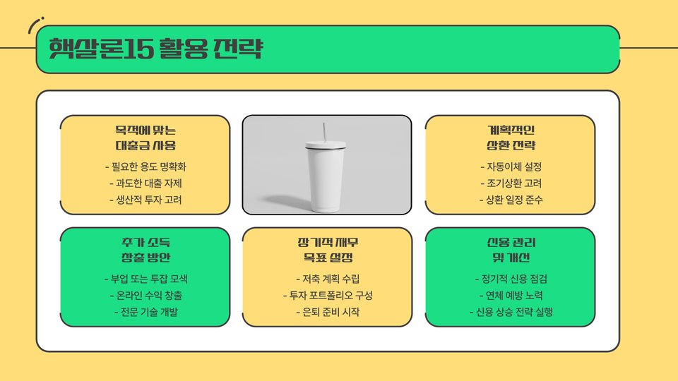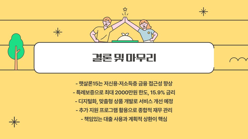 결국, 햇살론15는 단순한 대출 제도가 아닌, 경제적 어려움을 해결하고 낮은 금리로 자금을 확보할 수 있는 기회를 제공합니다. 이를 통해 개인의 신용도와 경제적 자립을 높이는데 큰 기여를 할 것으로 예상됩니다.