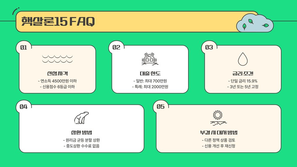 특히, 햇살론15의 특례보증은 대출 심사에서 유리한 조건을 제공하여, 대출이 어려운 분들도 자금을 마련할 수 있도록 도와줍니다. 이러한 이유로 햇살론15는 많은 사람들에게 필수적인 금융 상품으로 자리 잡고 있습니다.
