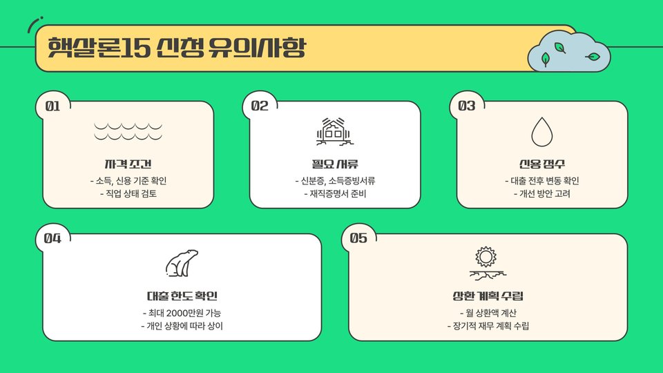 햇살론15를 이용할 때는 몇 가지 유의사항이 있습니다. 먼저, 대출 상환 능력을 정확히 평가해야 합니다. 자금의 용도와 상환 계획을 명확히 하고, 대출 금액이 적절한지 확인하는 것이 중요합니다.
