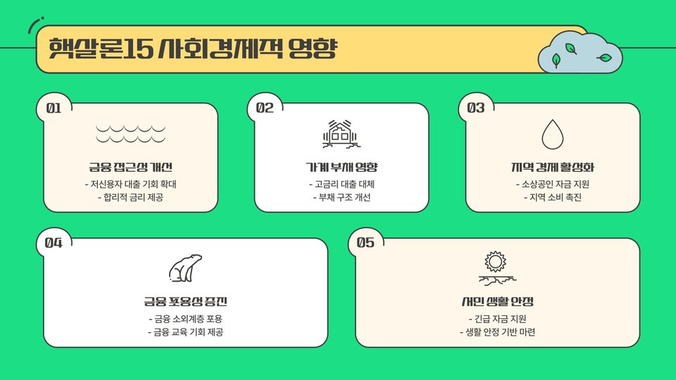 결국, 햇살론15는 단순한 대출 제도가 아닌, 경제적 어려움을 해결하고 낮은 금리로 자금을 확보할 수 있는 기회를 제공합니다. 이를 통해 개인의 신용도와 경제적 자립을 높이는데 큰 기여를 할 것으로 예상됩니다.
