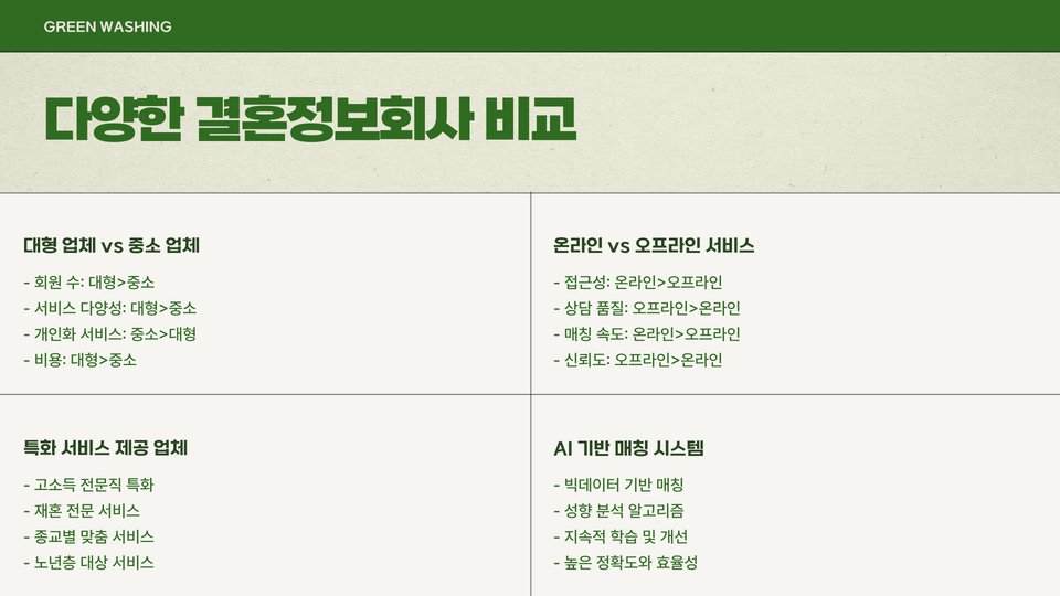 각 결혼정보회사가 제공하는 서비스는 조금씩 다릅니다. 어떤 회사는 일반적인 매칭 서비스를 제공하는 반면, 다른 회사는 개인 맞춤형 상담이나 추가적인 이벤트를 제공할 수 있습니다. 서비스의 다양성은 고객의 필요를 충족시키는 데 있어 중요한 요소입니다. 다양한 서비스를 통해 더 많은 선택권을 확보할 수 있습니다.