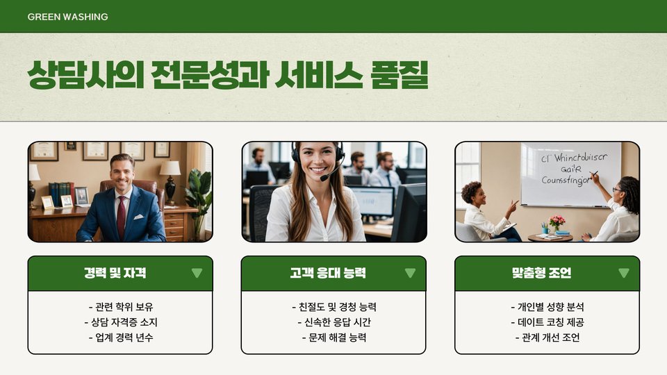 매칭의 성공 확률을 극대화하려면, 고객의 성격, 가치관, 생활습관 등을 종합적으로 고려하는 회사가 바람직합니다. 고객이 자신의 목표와 기대에 맞는 방향을 제시받을 수 있는지 체크해야 합니다.