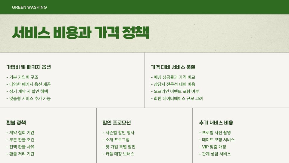 결혼정보회사를 선택할 때 반드시 고려해야 할 부분 중 하나는 비용 구조입니다. 몇몇 업체들은 높은 초기 비용을 요구할 수 있으며, 이후 추가 비용이 발생할 수 있습니다. 정확한 비용을 알고 시작하는 것이 중요합니다. 부가세나 수수료의 유무도 반드시 확인해야 합니다.