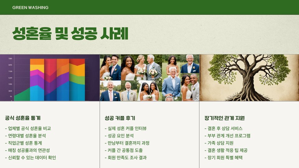 성공률은 단순히 결혼한 커플의 수로만 판단할 수 있는 것이 아닙니다. 고객의 만족도와 재이용률도 중요한 요소입니다. 사례 연구나 통계 자료를 통해 이러한 정보를 확인해보세요. 성공률이 높더라도, 고객의 피드백이 좋지 않다면 재고할 필요가 있습니다.