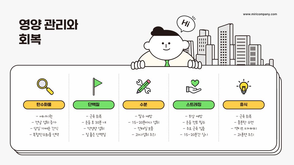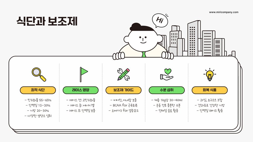 - 영양 관리와 충분한 회복은 성과에 큰 영향을 미칩니다.