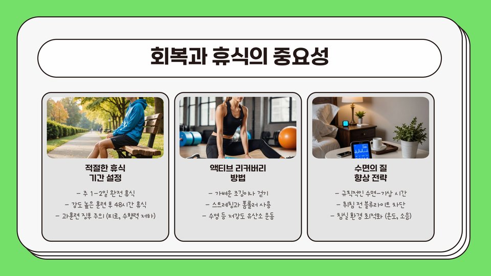 마지막으로, 회복 시간을 충분히 가지는 것이 중요합니다. 훈련 후 제대로 휴식을 취하지 않으면 부상의 위험이 증가하고, 효과적인 훈련이 방해받을 수 있습니다. 매주 1~2일은 완전한 휴식을 계획하여 신체를 회복시키는 시간을 갖도록 하세요.