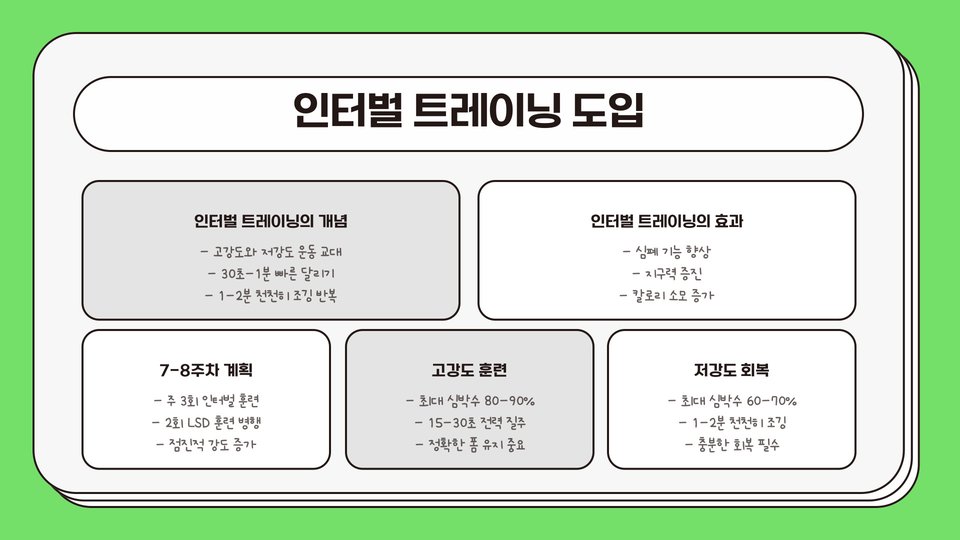 예를 들어, 인터벌 훈련은 짧은 시간 동안 빠르게 달린 후, 느린 속도로 회복하는 과정을 반복하는 방식입니다. 이러한 훈련은 심폐지구력을 크게 향상시킬 수 있습니다. 목표 속도에 가까워지는 효과도 거둘 수 있습니다.