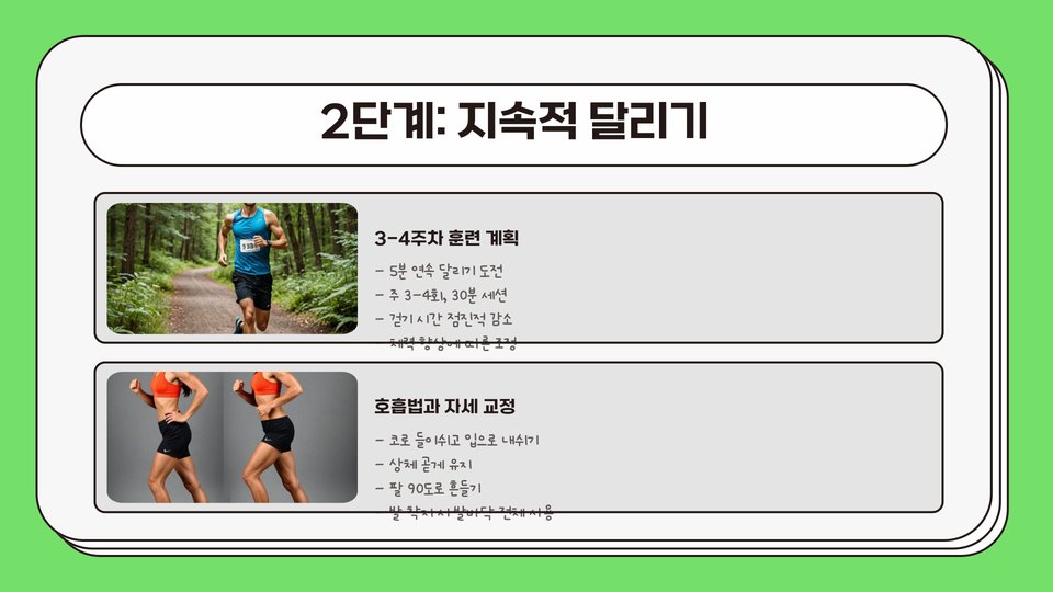 2단계로는 훈련 방법을 다양화하는 것입니다. 단순한 달리기 훈련 외에도 체중 훈련, 인터벌 훈련, 페이스 조절 훈련을 추가하여 훈련의 효과를 극대화할 수 있습니다. 다양한 훈련 방식을 통해 신체 각 부분을 고르게 발달시킬 수 있으며, 이는 지구력과 스피드 향상에 큰 도움을 줍니다.