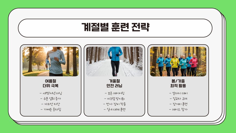 훈련을 시작하기 전에 구체적인 훈련 계획을 세우는 것이 중요합니다. 목표 날짜를 정하고, 그에 맞춰 주간 훈련 일정을 만들면 좋습니다. 이 계획에는 다양한 훈련 유형이 포함되어야 하며, 예를 들어 지구력 훈련, 인터벌 훈련, 회복 훈련 등을 포함할 수 있습니다. 주 3~4회 정도의 훈련을 목표로 하되, 각 훈련의 강도를 조절하는 것이 중요합니다. 초보자라면 적당한 강도로 시작하여 점차 강도를 높여가는 것이 좋습니다.