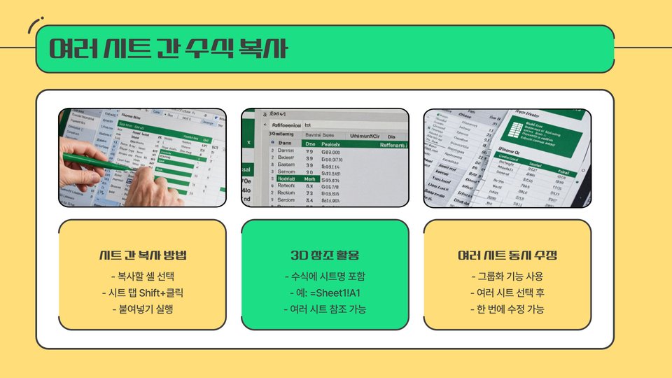 - 특정 셀 참조: 다른 시트의 셀을 참조하는 수식을 통해 복잡한 작업을 간단하게 처리할 수 있습니다.