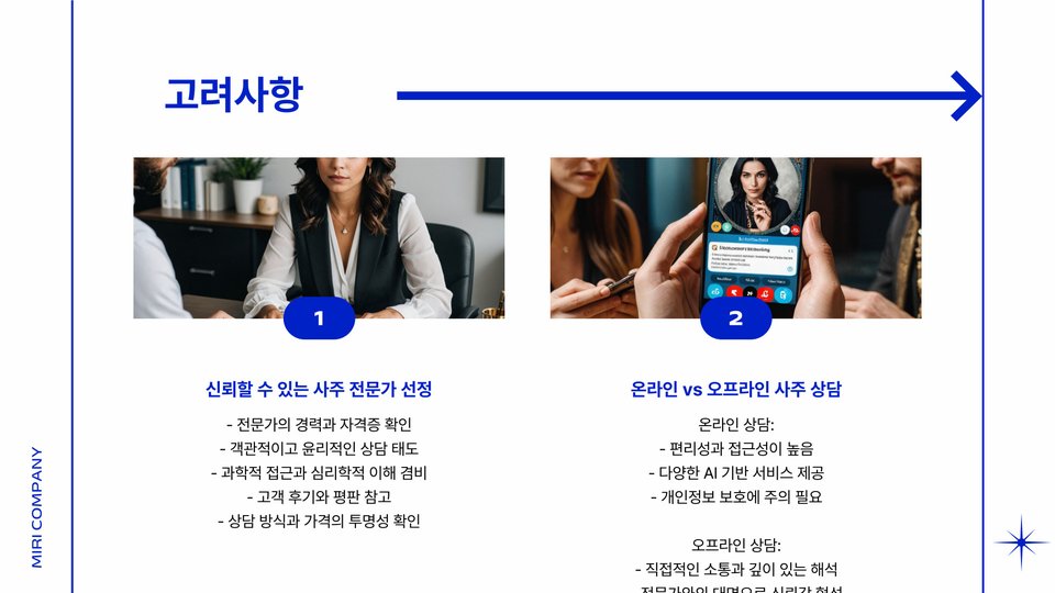 커플사주를 선택할 때 몇 가지 중요한 요소를 고려해야 합니다. 첫째, 전문가의 신뢰성을 검증하는 것입니다. 요즘은 많은 사주 전문가가 존재하므로, 해당 전문가의 경험과 리뷰, 추천을 읽어보는 것이 중요합니다. 커플사주는 배우자의 성격과 방향성을 더욱 명확히 해줄 수 있는 귀중한 정보이기 때문에, 신뢰할 수 있는 전문가에게 상담 받는 것이 최선입니다.