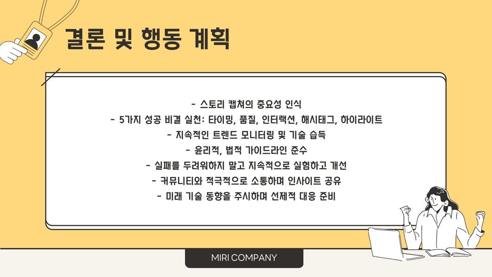 이번 포스트에서는 인스타 스토리 캡쳐의 성공 비결 5가지를 알아보았습니다. 창의적인 콘텐츠 제작, 팔로워와의 상호작용, 일정한 주기 유지, 진정성과 스토리텔링, 그리고 최신 트렌드를 반영하는 것이 핵심입니다. 이러한 요소들을 잘 활용하면, 더욱 많은 사람들과 소통하고, 인스타그램에서의 영향력을 확대할 수 있습니다.